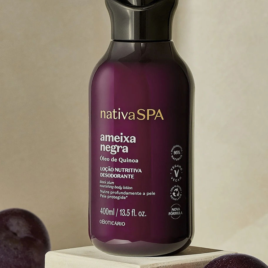Nativa SPA Black Plum (Ameixa Negra) Body Moisturizing Lotion is a stimulus for the skin. It is the union of deep hydration with a delicious amber Plum aroma. Its formula is enriched with purified quinoa drops, which increase collagen production and prevent the loss of skin elasticity.