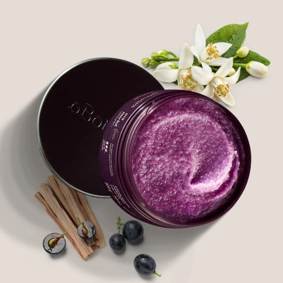 The Merlot Grape Body Scrub is formulated with grape seeds and rich sugar crystals, leaving skin soft, velvety, and fragrant, with an elegant fragrance that promotes confidence¹ through the exclusive Merlot Essence Accord. ¹Fragrance developed with neuroscience
